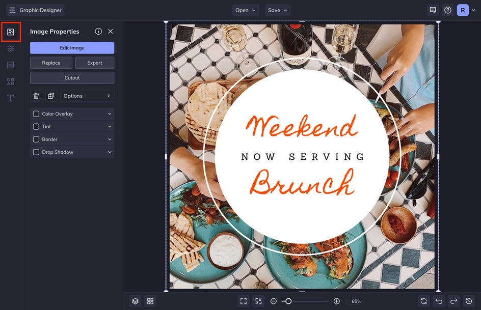 To customize the image, simply select the image and an Image Properties menu will appear. From here, you can adjust the Tint and color Overlay, add a Border, or select Edit Image to use our Photo Editor to add filters and fully edit your image.
