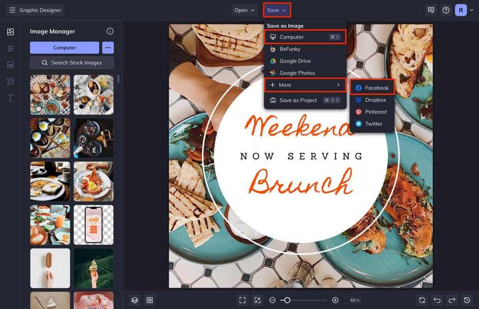 When you are finished designing, select Save at the top of your screen and then select Computer. Save the image as a JPG at high quality. I also like to save these as a project to come back and edit later if I need to. To do this, select Save as Project.