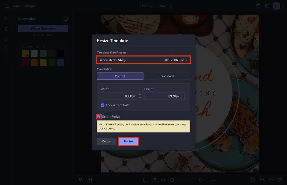 After I save the design to my computer and also as a project, I then head into the Customize tab and select Resize Template. This is so that I can save this same design in different formats to use across platforms.