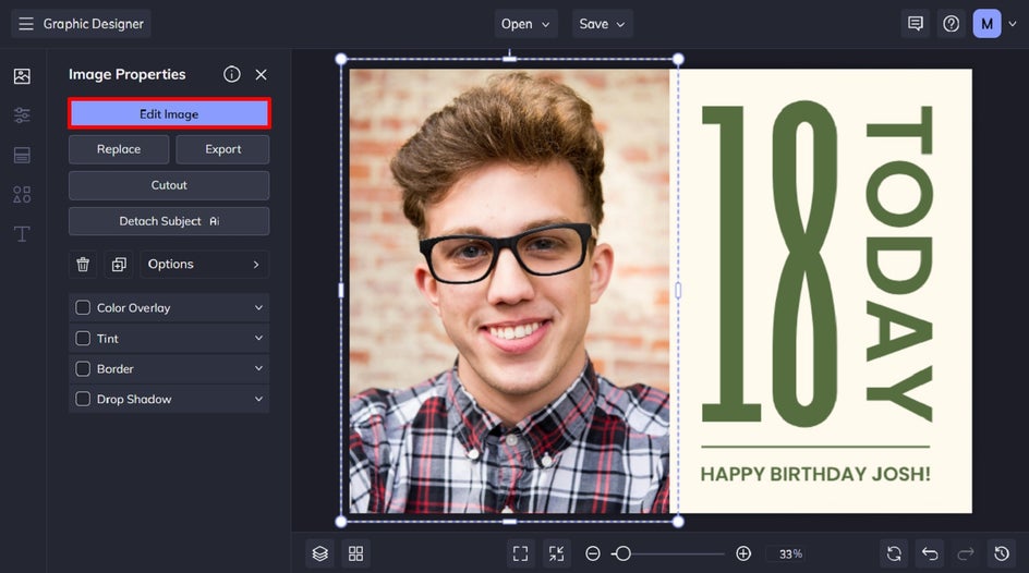After adjusting the placement, click on the photo and select Edit Image to be brought directly to the in-platform Photo Editor. This gives you access to hundreds of photo editing tools without ever needing to leave the Designer.