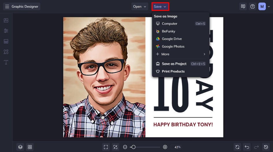 The process is simple: Just load up one of the Designer’s premade templates, insert your own image, and then use the in-platform Photo Editor to apply an instant cartoon photo filter to the image. There’s no need to export any files or even switch tabs – everything can be done in one place with a host of intuitive design and editing tools. You can then share your designs online, print them at home, or have them professionally printed.