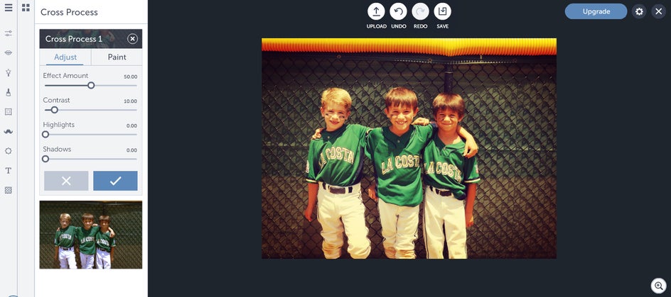 To give our boys of summer image a nostalgic twist we applied a couple overlays from within BeFunky's many glorious Effects. Combining Chromatic 1 and Cross Process 1 gave us a nice old-fashioned sepia feel, while setting the guys apart from the background just so. You can experiment to get your ideal amount of color and coverage by adjusting the Effect Amount and other levels.