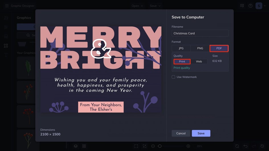 If you're wondering if you can print your custom creation at home, the answer is "yes"! You can skip a trip to the printer entirely. Just be sure to select PDF and Print Quality when you save your Christmas card design to your computer. Although you can technically print on regular printing paper, we recommend using cardstock paper to ensure that your card is durable enough to travel and be handled by your recipients without getting creased.