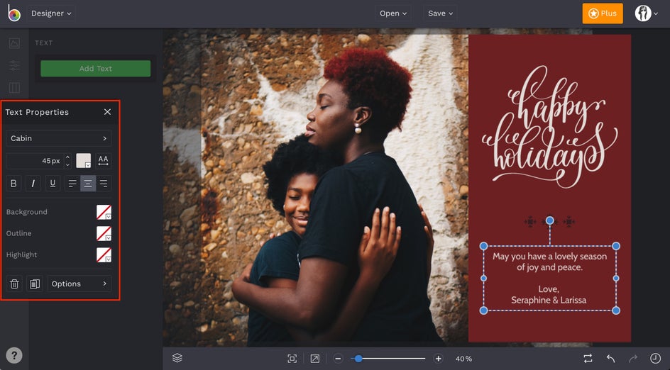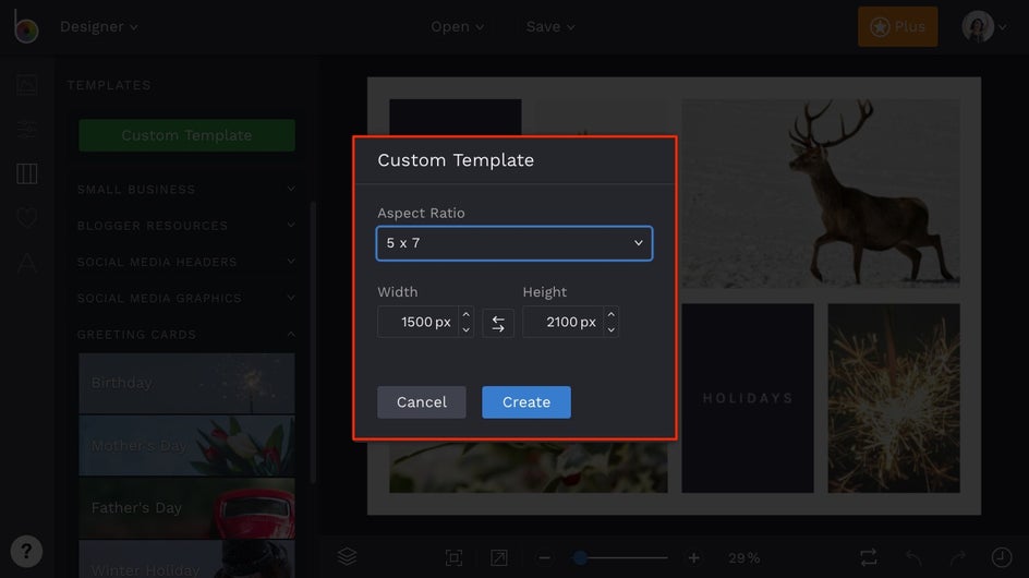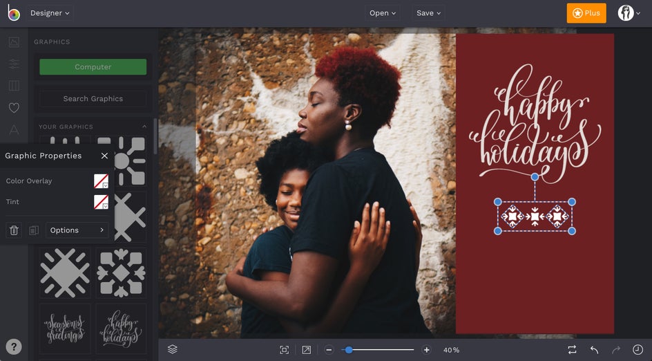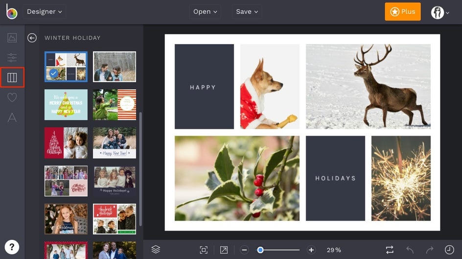 There are a couple of ways to make a holiday card in BeFunky’s Designer platform. The first, and easiest way, is to use our pre-designed templates. Click here to head to the Holiday Card Maker.