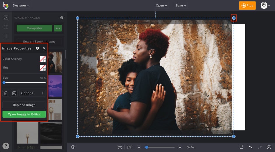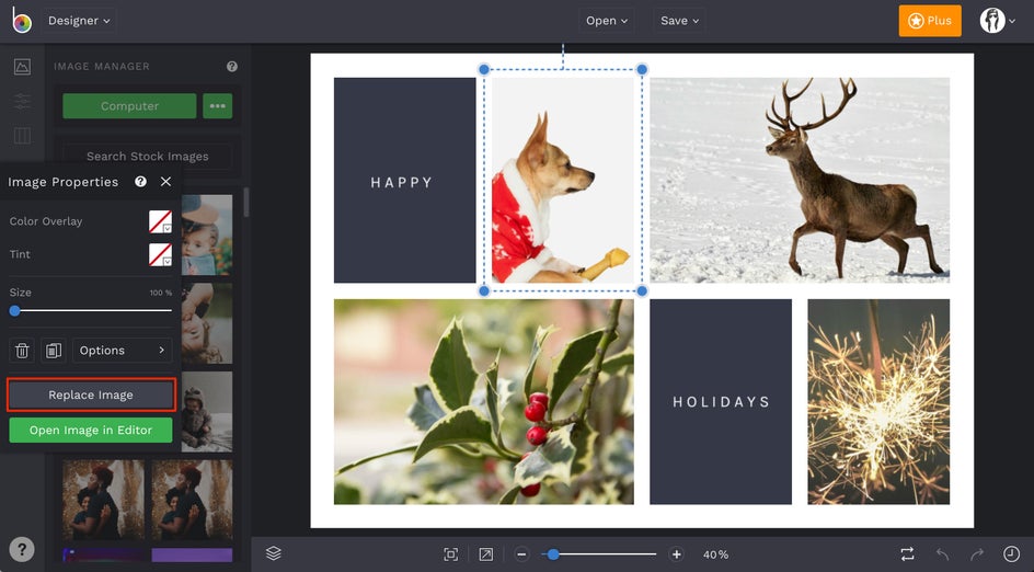 To change the imagery on your Christmas card template, simply upload your favorite photos to your Image Manager. You can do this via your computer, a drag-and-drop, or your Image Library.