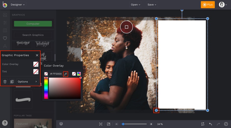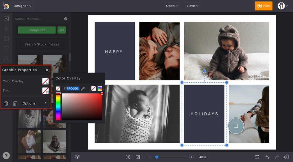 You also have the option to edit the preset graphics or add your own! For this example, we've decided to simply change some of the Christmas tree colors. To do this, click on the graphic you want to change and a Graphic Properties menu will pop up. Then, click on Color Overlay, and choose your color!