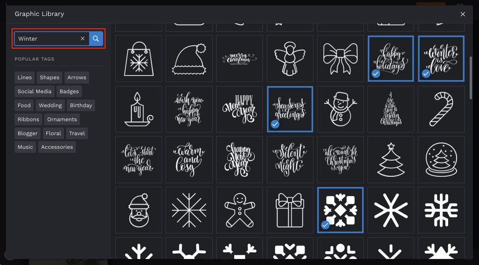 If you want to customize your graphics further, head to the Graphics tab, where you'll find our Graphic Library, as well as the option to upload your own! There are plenty of festive graphics to choose from, including Christmas trees, Santa Claus, gifts, candy canes, and so much more.
