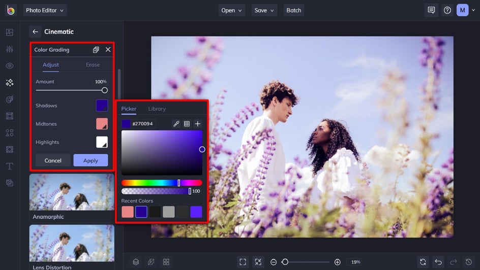 Whether you want to make your own photo filters or merely need to enhance a photo's color, the Color Grading effect is for you. You can apply multiple colors to your image's Shadows, Midtones, and Highlights within the Settings menu to create a completely customized color scheme. You can be as creative or as natural as you like, as the color options are unlimited. As a result, you'll be able to design unique photo filters that no one else has!