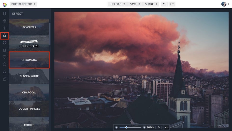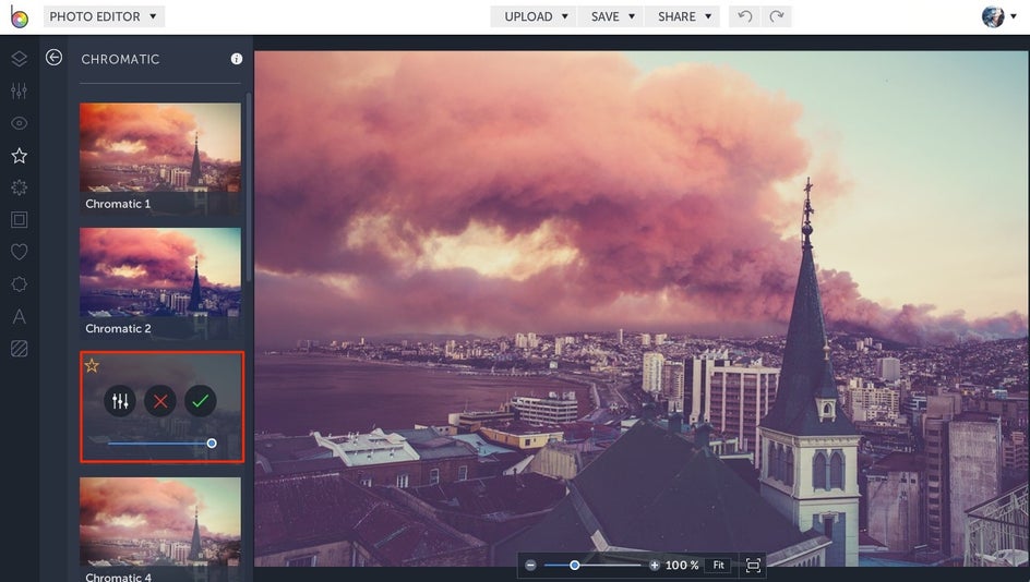 To add a vintage feel to your images without reducing the quality, use a Chromatic effect to your photo. These effects have the ability to slightly tint the image, as well as adjust the overall temperature of the photo in seconds. There are several Chromatic effects to choose from, simply select the one that looks best on your cityscape and adjust the power of the effect with the slider.