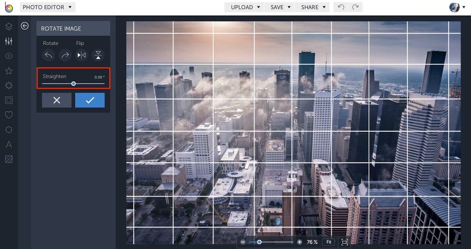 When your cityscape isn’t lined up perfectly with your image, the Straighten tool within the Rotate tab is a great option. Use the slider and guidelines on the image to level out your photo so the horizon is expertly placed. This helps your image feel ideally composed and makes for a better final product.