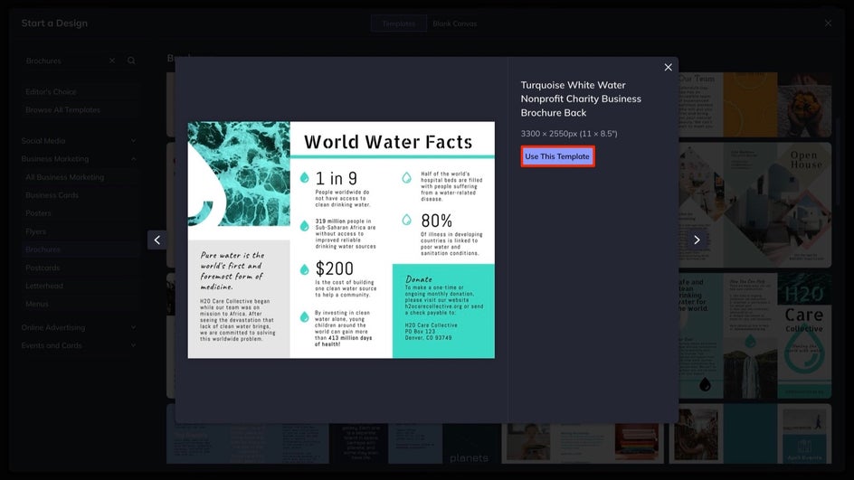 To get started, head to the Brochure Maker. Find a template you like, and then click the Use This Template button to start working on it.