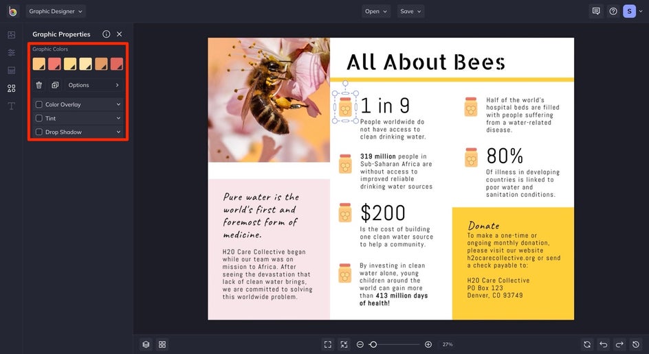 Click on a graphic to open the Graphic Properties menu, where you can tweak the color, add a tint, or layer in shadows for depth.