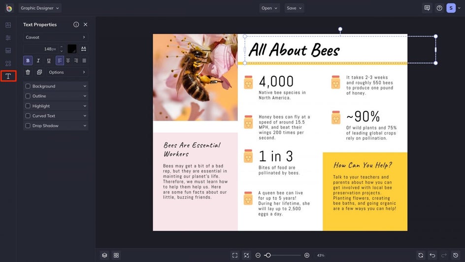 To edit text, simply click on any text box in the template. The Text Properties menu will appear, allowing you to change fonts, colors, alignment, size, and more. You can also open the Text tab to add additional text boxes wherever you need them.