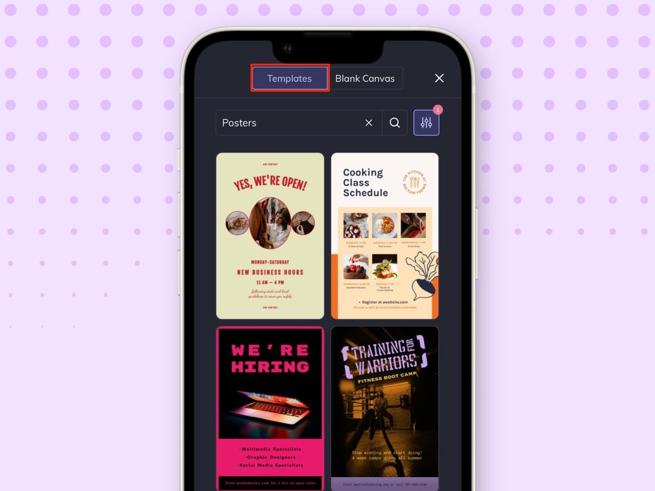 Once here, select the size of the canvas you want to use or select the Templates tab at the top of the screen in order to choose a premade template to start with. We are going to select a template by choosing the one we want and then hitting Use This Template.