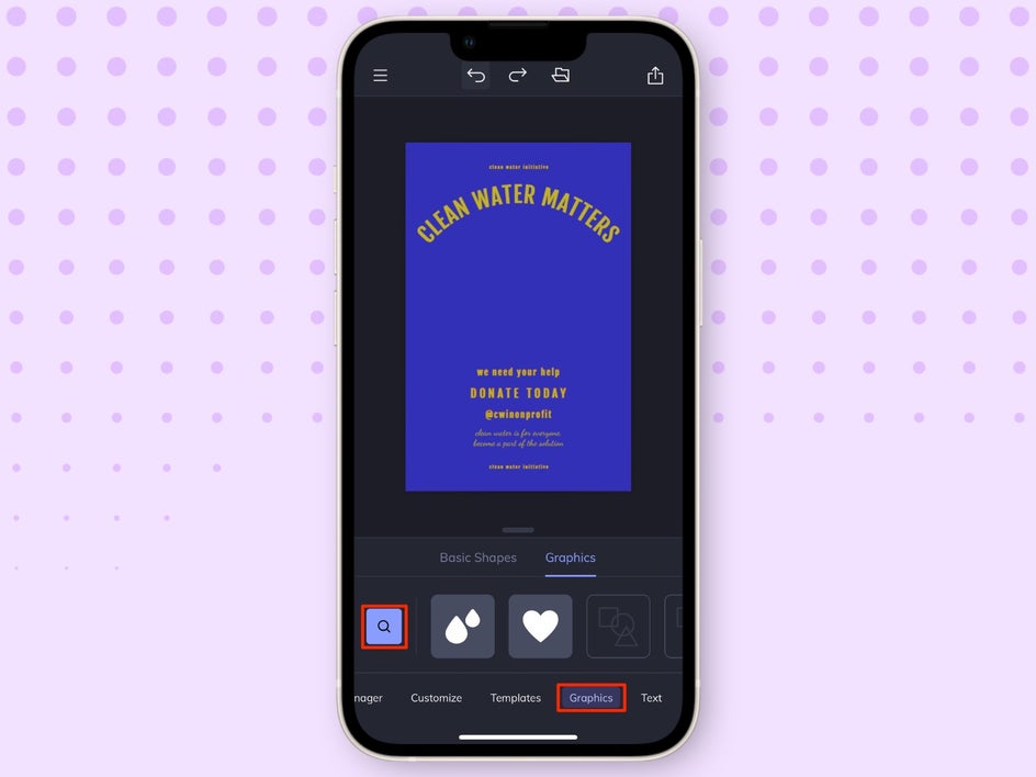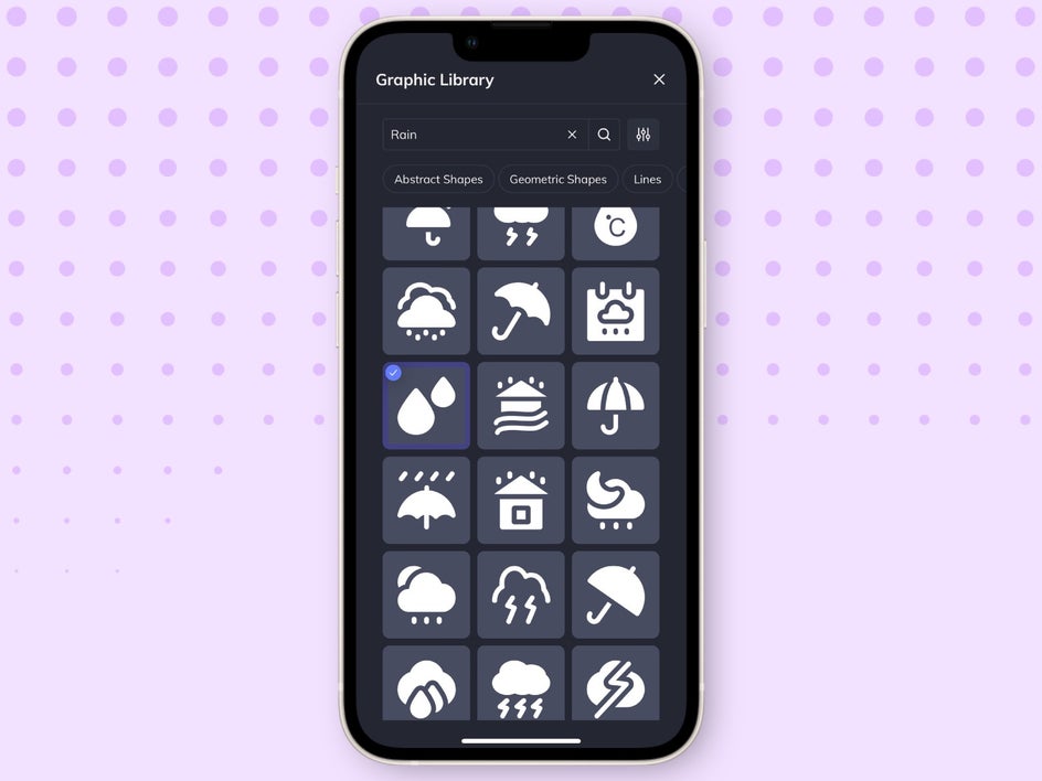 Select the magnifying glass to search for the shape you want to add to your Graphic Library – you will notice that when you select the graphic element, a blue checkmark will appear; this means that the element has been added to your Graphic Library. Once you are done, select the ‘X’ at the top right of the screen to go back to your Graphic Library.