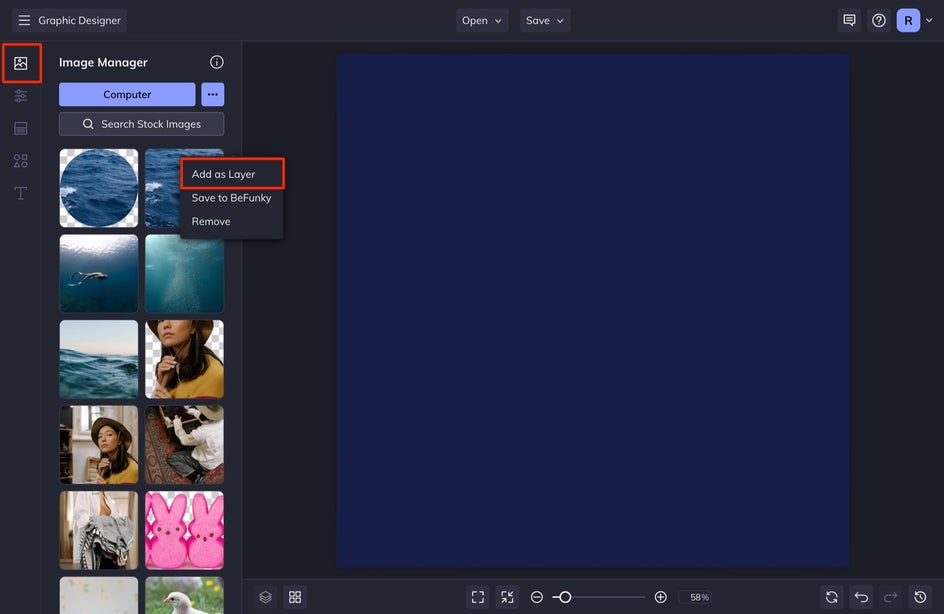 Head to Image Manager and select the image you want to use by either uploading it or selecting a stock image. Once you add the image to your Image Manager, select it and Add as Layer.