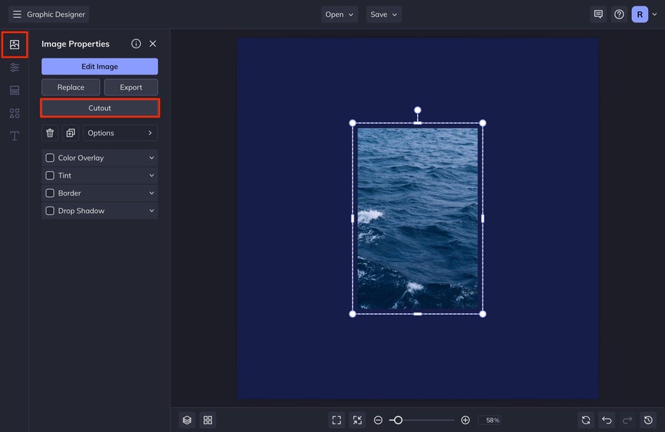 Now on your canvas, with the image selected, click Cutout in the left-hand menu.