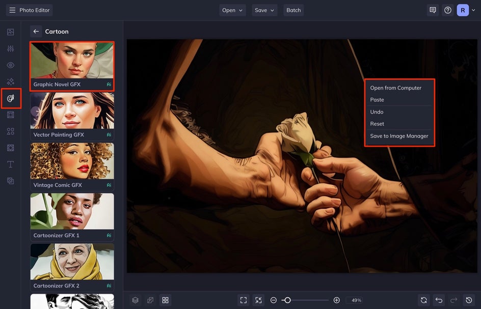 Once you have your story laid out and you have the images selected that you want to transform into a graphic novel, head to BeFunky’s Cartoon category to get started.
