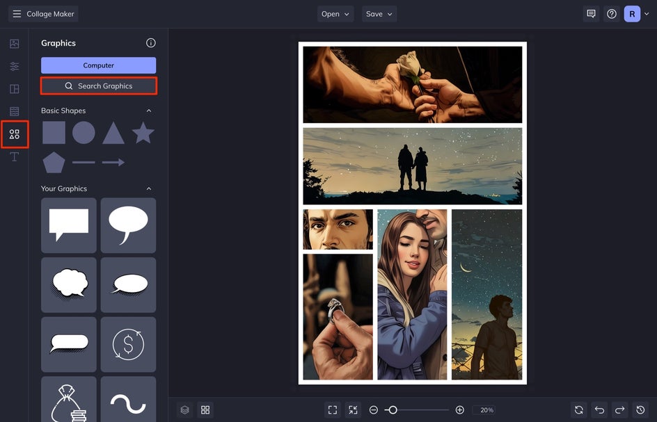 Comic books have word bubbles and boxes where the dialogue goes – you can find these in the Graphics tab in the left-hand menu by selecting Search Graphics.