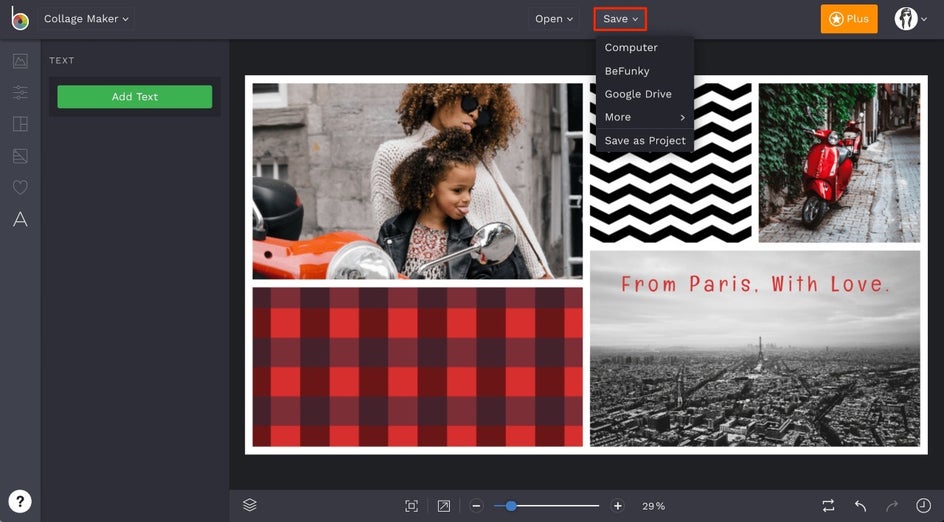 Finally, click on the Save menu at the top of your canvas. For basic printing needs or sharing on social media, we recommend saving your file as a JPG or PNG. Want to print a large, high-quality collage for framing? Be sure to save your file as a PDF in Print Quality.