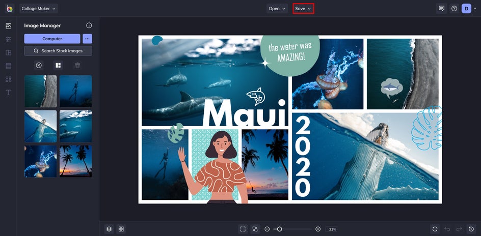 When you’ve done with your masterpiece, click the Save button at the top of the page to save it to your desktop, BeFunky account, and more.