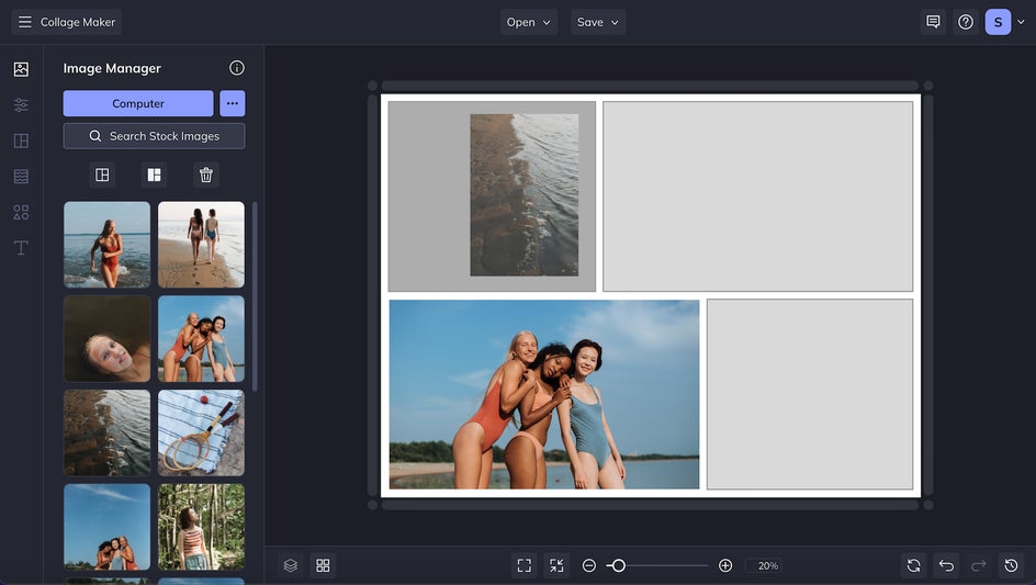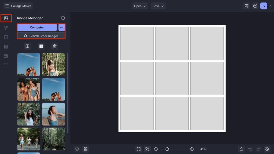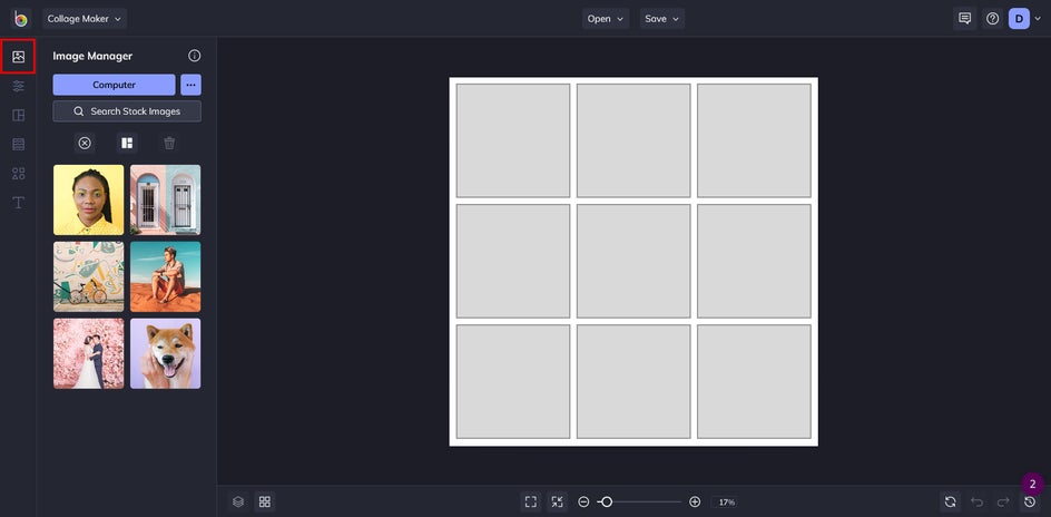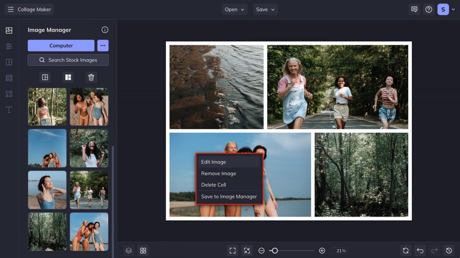 If you choose to use our collection of stock images, just enter your search term and click on any results you find intriguing. Any photos you click on will appear in your Image Manager once you exit the Library. Selected images will appear as thumbnails that you can drag and drop into collage cells.