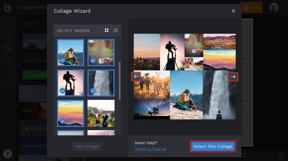 If you’re happy with the presented collage layout, click Select This Collage in the bottom-right corner of the screen. You can also preview more collage layouts by clicking the right arrow or view a previous collage layout by clicking the left arrow.