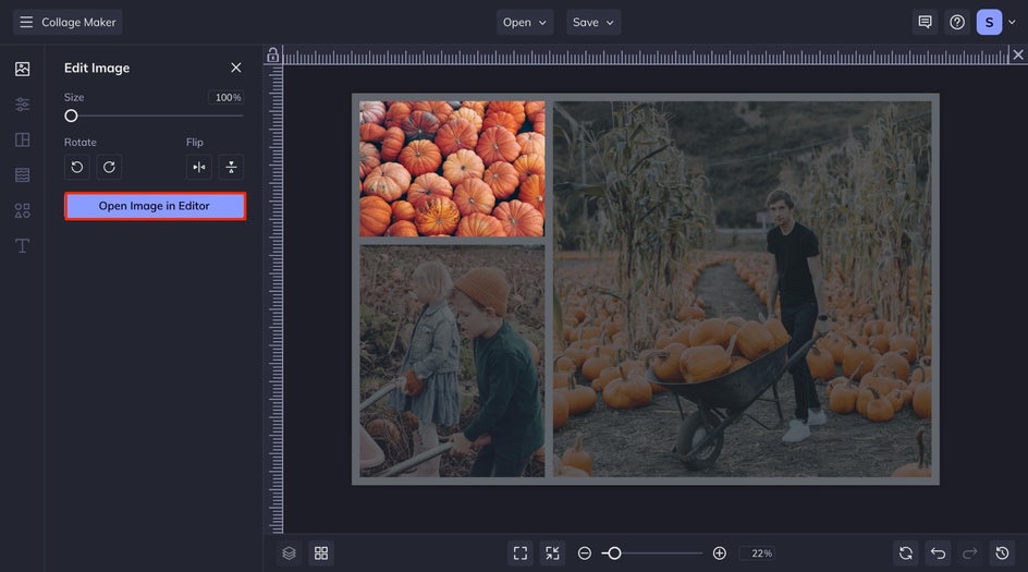Select a layout that suits your project by clicking on the Layouts tab and uploading your photos to the Image Manager. After you have settled on a layout and uploaded your images to the cells you want them in, click on the image you want to edit. Then click Edit Image.