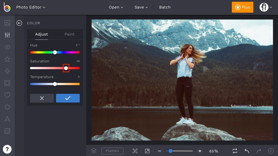 Hue can be the most difficult of the three to master when trying to achieve perfect tonal balance. Adjusting it too much can easily lead to an unrealistic technicolor image. You’ll see that the slider in BeFunky’s Color tool is marked with a rainbow of color, but when adjusting the slider, the color you land on will do the opposite on the color wheel to the hues in your image. For example, sliding the scale to the green range will produce more purples in your image, the red range will give you more blues, and so on.