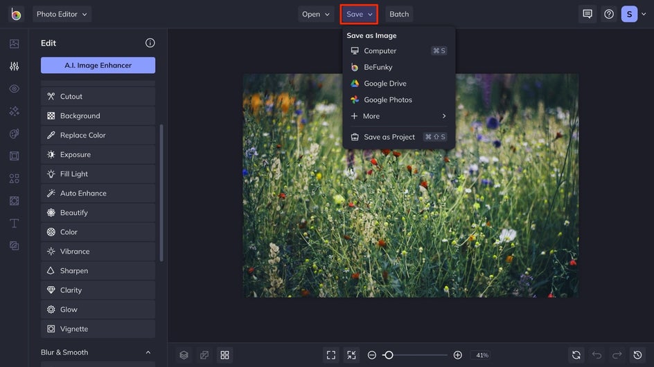 Once you have finished applying your color correction, click the Save button at the top of the interface and choose your desired location. Share it directly to social media, or as a project to come back to later!