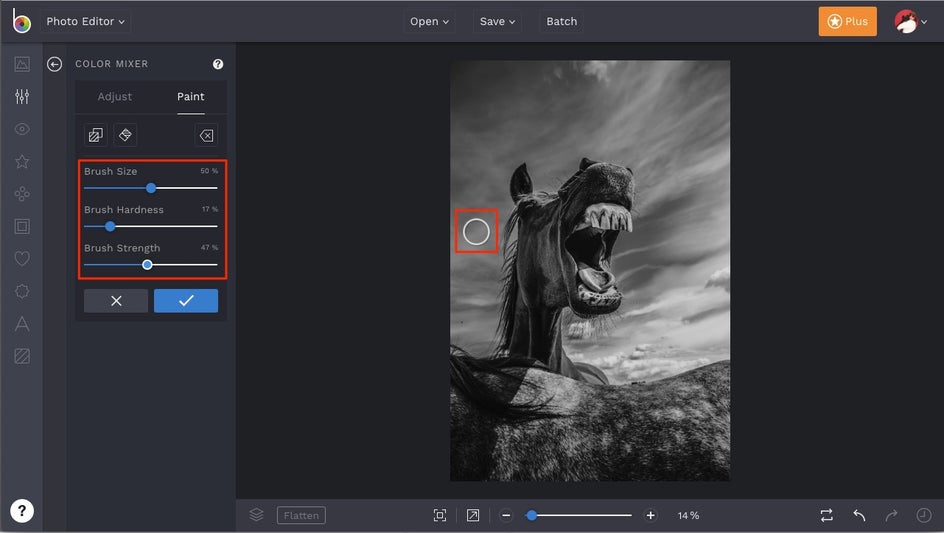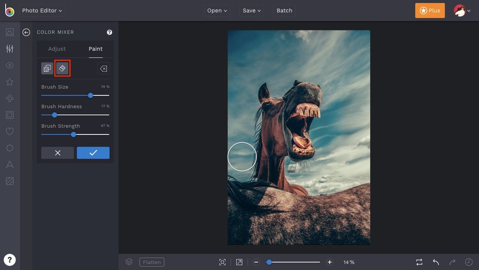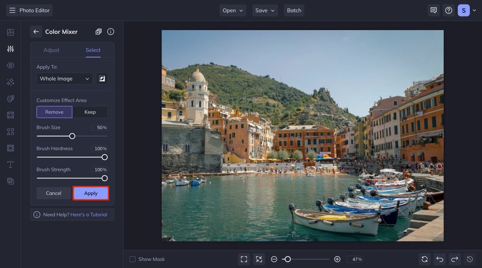 For even more control, try using the Select tab to paint the effect onto specific areas of the photo. This way, you can enhance certain details or tones without affecting the entire image, giving you a more refined and customized result. Simply adjust the size of your brush and swipe it on the image as to where you would like to keep or remove the color correction. Once you are happy with your results, click Apply.