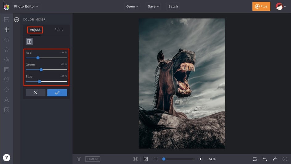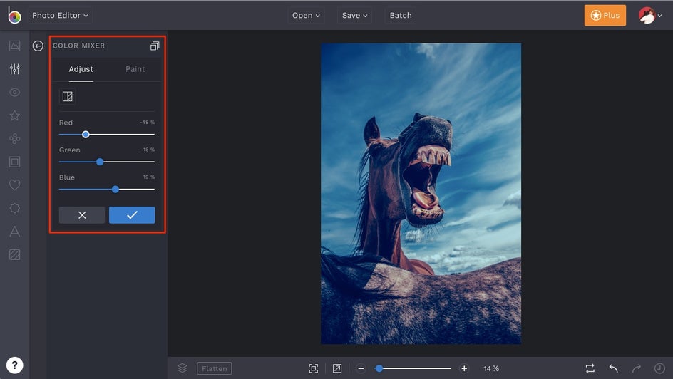 The Color Mixer tool in BeFunky is an essential color corrector for anyone wanting precise control over color correction. This powerful color tool lets you adjust each part of the RGB color spectrum individually, so you can correct colors with ease and get the exact look you want. Whether you’re dealing with overly warm tones or cool tones, the Color Mixer makes it simple to balance and adjust red, green, and blue hues, bringing out the best in every photo.
