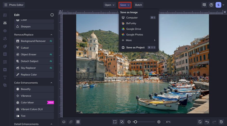 After finishing your edits, click Save at the top of the screen and select your preferred save location. For this tutorial we selected Computer and the JPEG format, ensuring the image is saved at the highest quality setting for the best final result. This way, your edited photo is crisp and ready for sharing or printing!