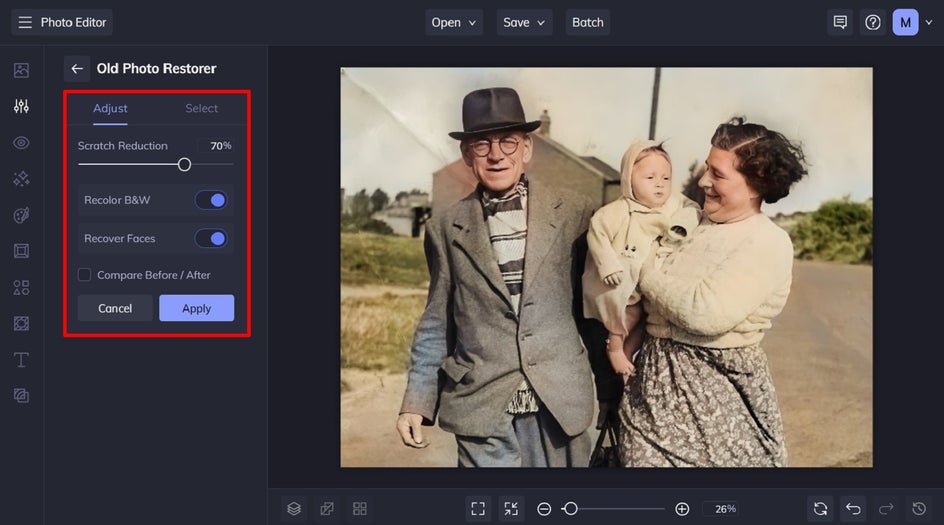 Ready to colorize a photo? Head to the Old Photo Restorer and open the image you wish to recolor. If you want to recolor an old, printed photo, you will need to scan the original photo to create a digital copy of it.