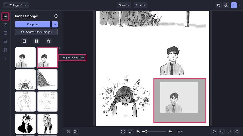 To add your comic panels to the page, click the Image Manager at the top of the sidebar and then click Computer to upload. If you want, you can also click and drag from your desktop files directly into the Image Manager.