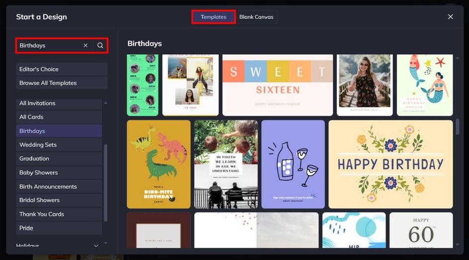 To start, head directly to the Birthday Card Maker and choose a template. For this example, we’ll be creating a digital birthday card for a 4-year-old girl. Want to craft custom kid’s birthday cards for free? We even have a range of free birthday card templates available, so be sure to check those out too!