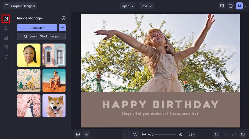 The first thing you’ll need to do is to change the template’s existing photo (or photos) for one that features your birthday girl or boy. To do so, navigate to the Image Manager tab and upload your own photo. Then, simply drag and drop it onto the existing placeholder image.