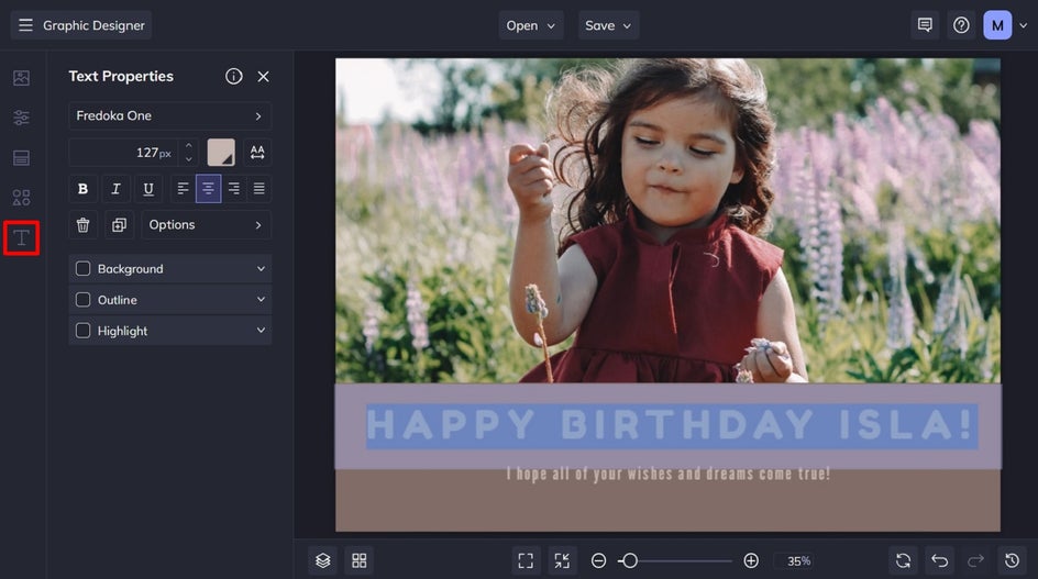 You’ll also want to edit your card template’s existing text to include a personal birthday message. Double-click any text box you wish to change and add a special birthday message. From the Text Properties menu which appears when you click on a text box, you can also adjust the font, text size, text color, spacing, and more.