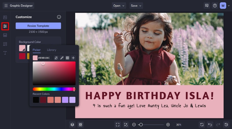 Want to change the background color of your kid’s birthday card design? Navigate to Customize in the main menu, then select a new shade from the color swatches. Clicking the first swatch will open the Color Picker, from which you can choose any color you want.