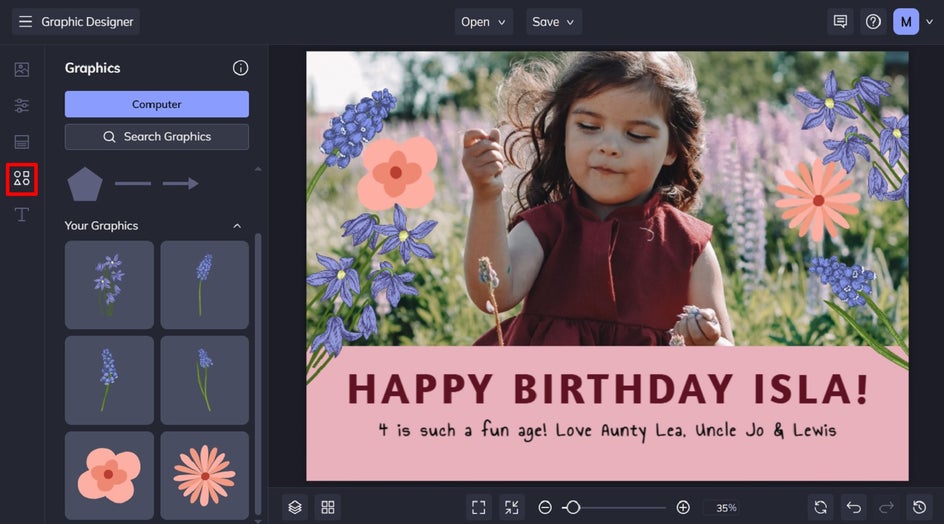 You can also add fun graphics to your birthday card by clicking on Graphics in the main menu on the left. There are basic shapes to choose from, or click Search Graphics to access our huge library of clip art, symbols, illustrations, and more. Once selected, drag and drop the new graphics onto your card design and reposition or resize as needed.