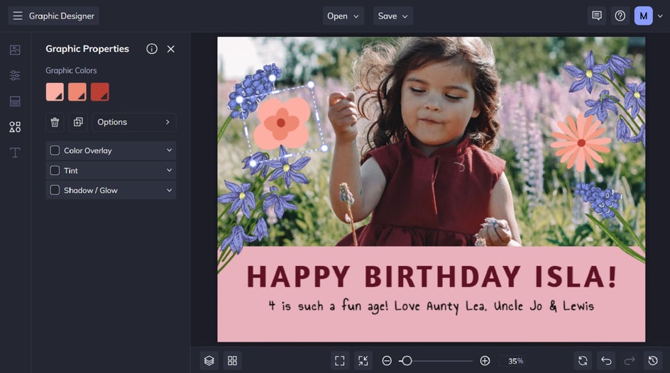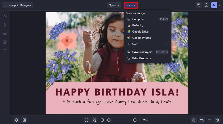 Once you’ve finished designing your custom kid’s birthday card, all that’s left to do is to save it. Click Save at the top of the screen, then choose your save location and format.