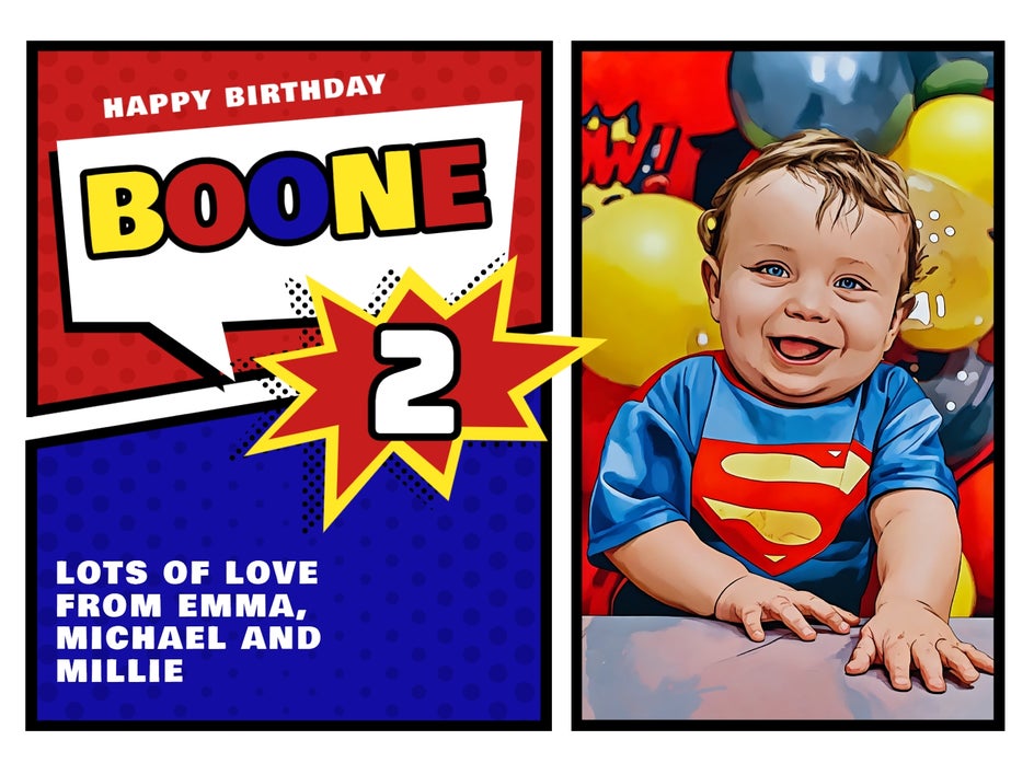 Creating a card for a superhero-loving kid? Add some action-packed flair by applying the Pop Comic or Graphic Novel DLX effect to their photo. These styles give the image bold outlines and dynamic coloring, making it look like it jumped straight out of a comic book. Pair it with bright primary colors, dot graphics, and comic book inspired fonts for maximum impact.