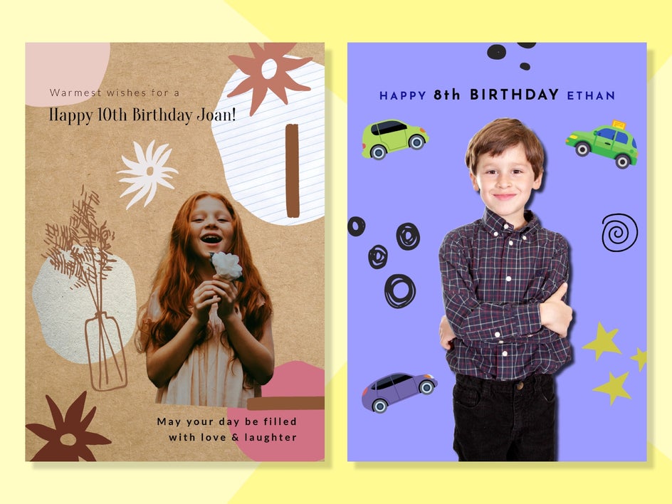 Our Card Maker is packed with professionally designed templates you can fully customize. From bright and cheerful layouts to soft and whimsical ones, there’s something for every age and personality. So, whether you want to create a homemade birthday card for a toddler or a teen, we’ve got your sorted. All you need to do is swap out a photo, update the text, and you’ve got a birthday card that’s as unique as the child receiving it.
