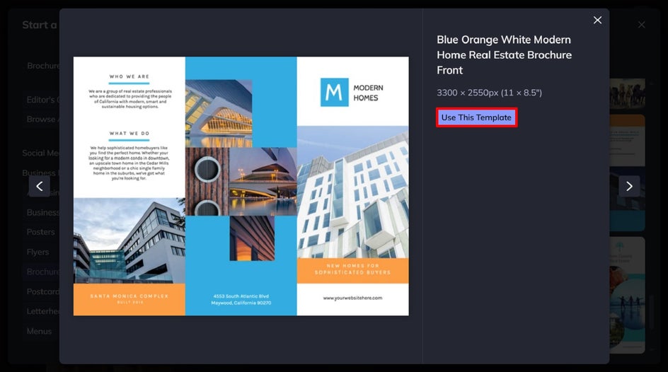 To get started, head to our Brochure Maker and choose one of our real estate-themed brochure templates. Each brochure template includes a matching front and back layout, perfect for the standard tri-fold format that looks great in print and fits easily in hands (or mailboxes!).