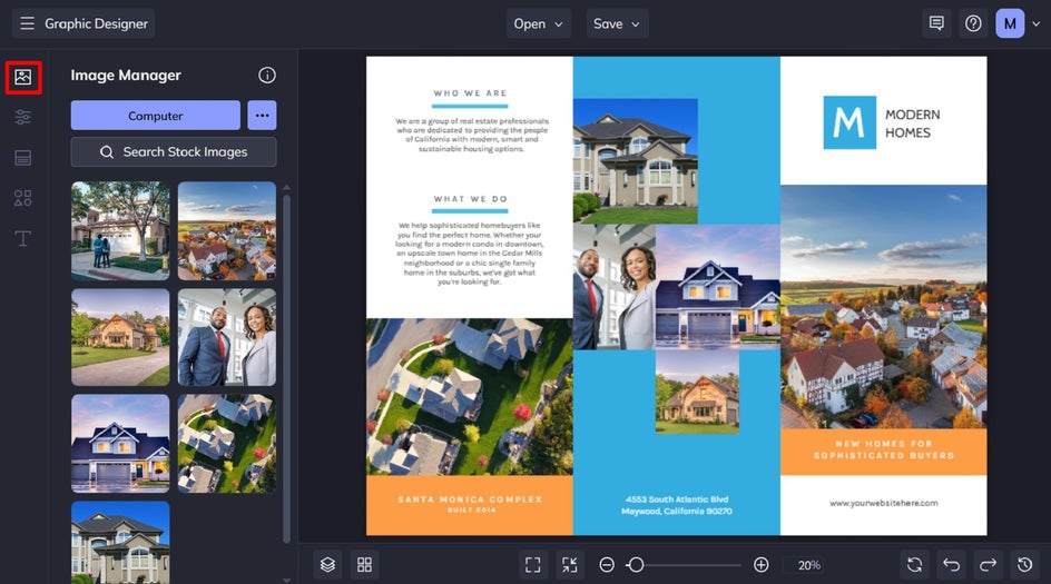 Open the Image Manager from the left-hand menu to upload your property images. You can drag and drop your photos directly into the template’s image placeholders.