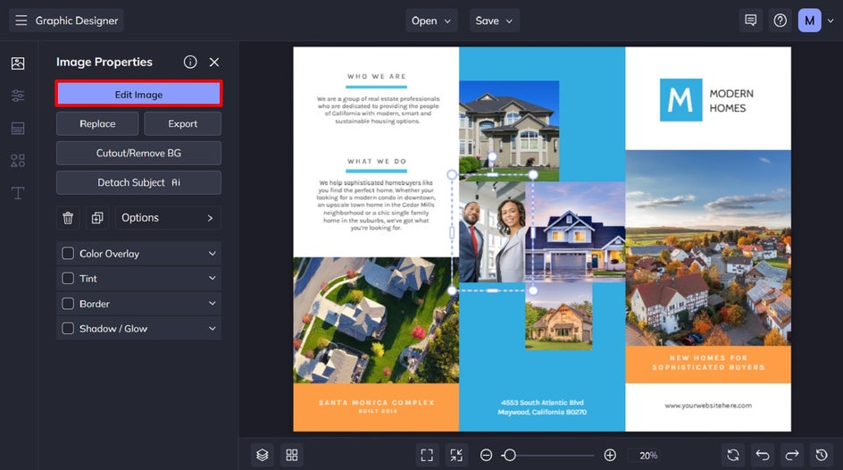 Want to enhance your photos before adding them in? Click Edit Image to open the Photo Editor, where you can brighten, crop, sharpen, or even remove distracting objects from your real estate photos.
