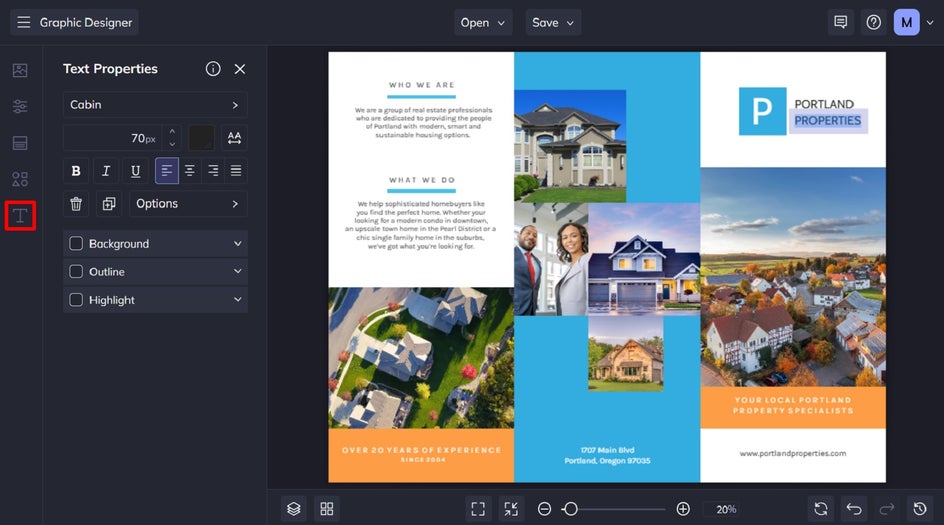 Use the Text Properties menu to adjust fonts, sizing, and spacing so your brochure is easy to scan. You can even upload the fonts of your personal or agency branding.