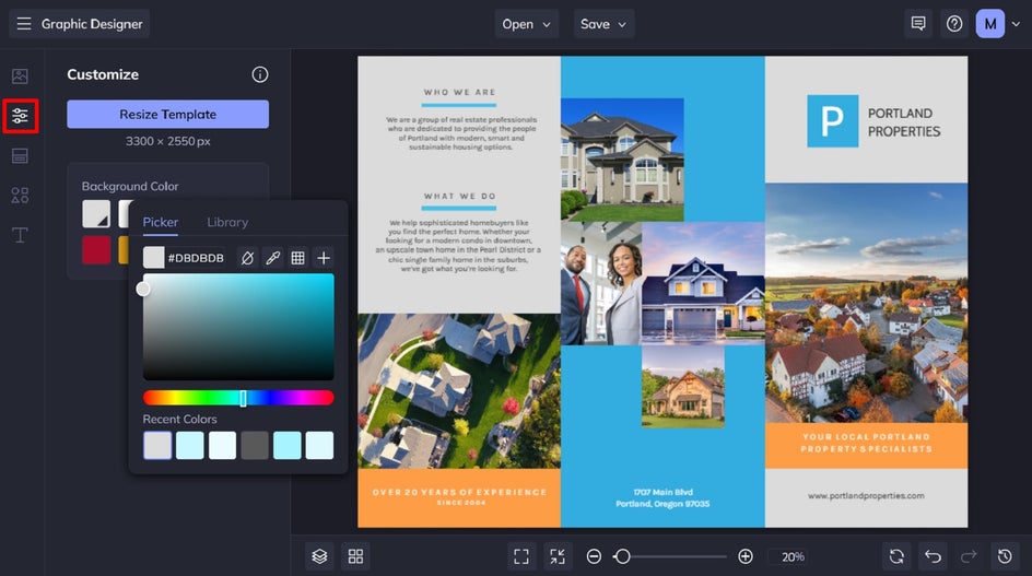 If you wish to change the background color of your brochure template, navigate to Customize in the main menu. There are several color swatches to select, or you can click on the first color swatch to open the Color Picker. From here, you can select any color you want, or input a specific HEX code if you had a particular shade in mind.
