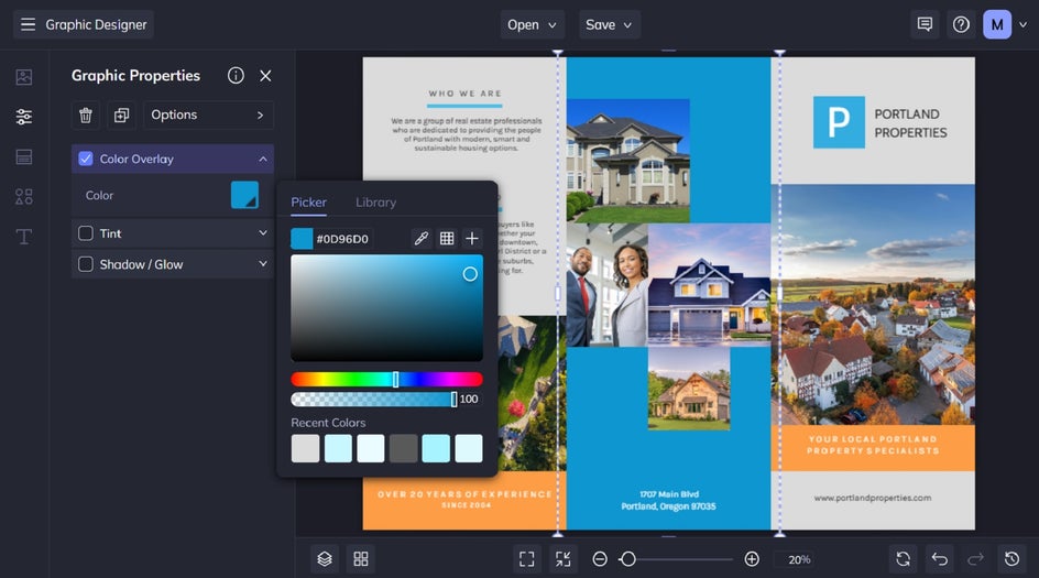 Want to change the color of an existing graphic or shape on your real estate brochure? Just click on the graphic or shape, then select a new color from the Graphic Properties panel.