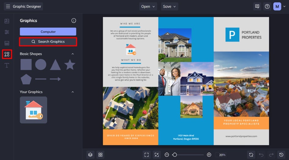 You can also insert additional graphics by navigating to Graphics in the main menu, followed by Search Graphics. Then, drag and drop your new graphics from the Your Graphics section onto your brochure template.